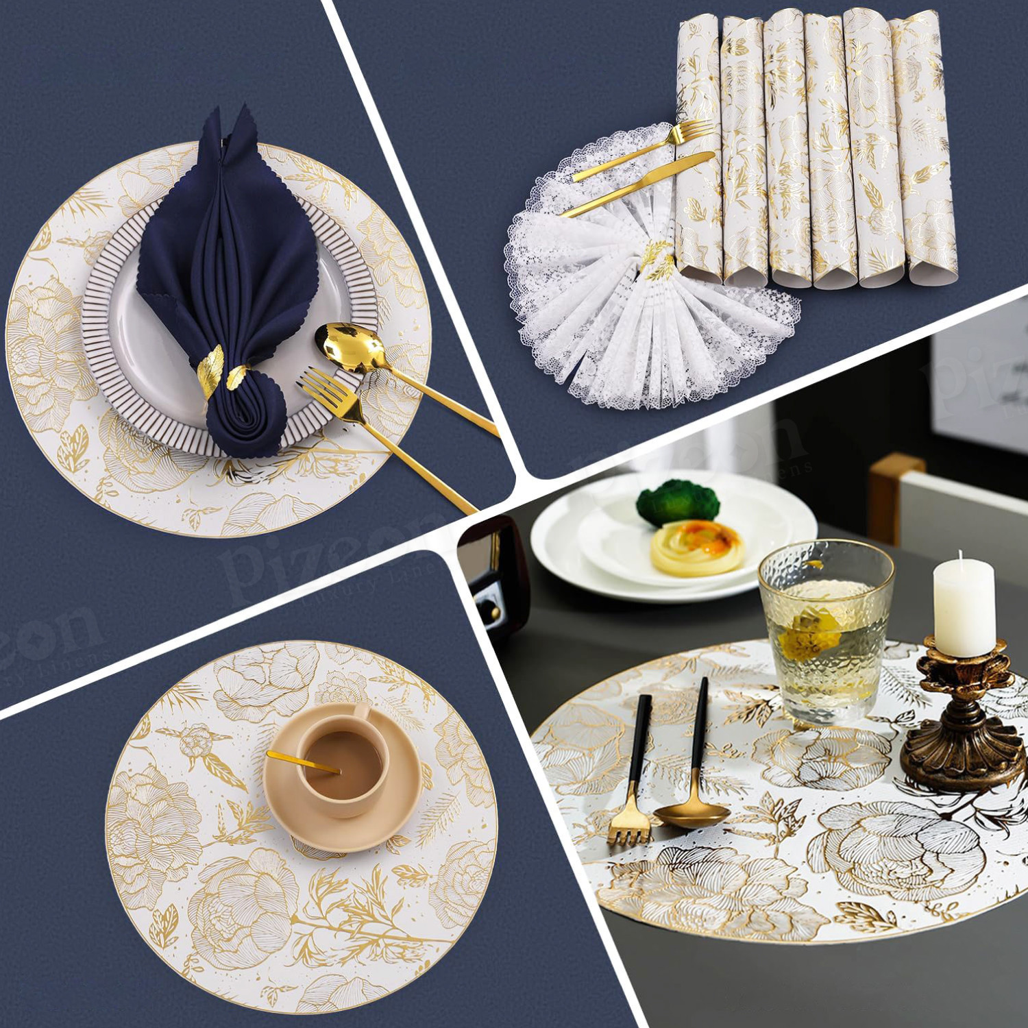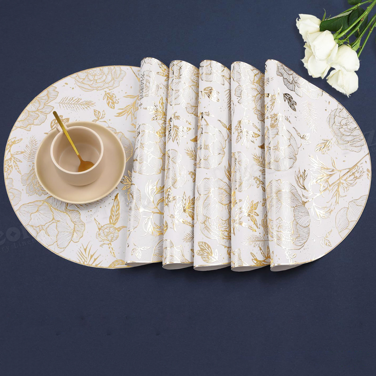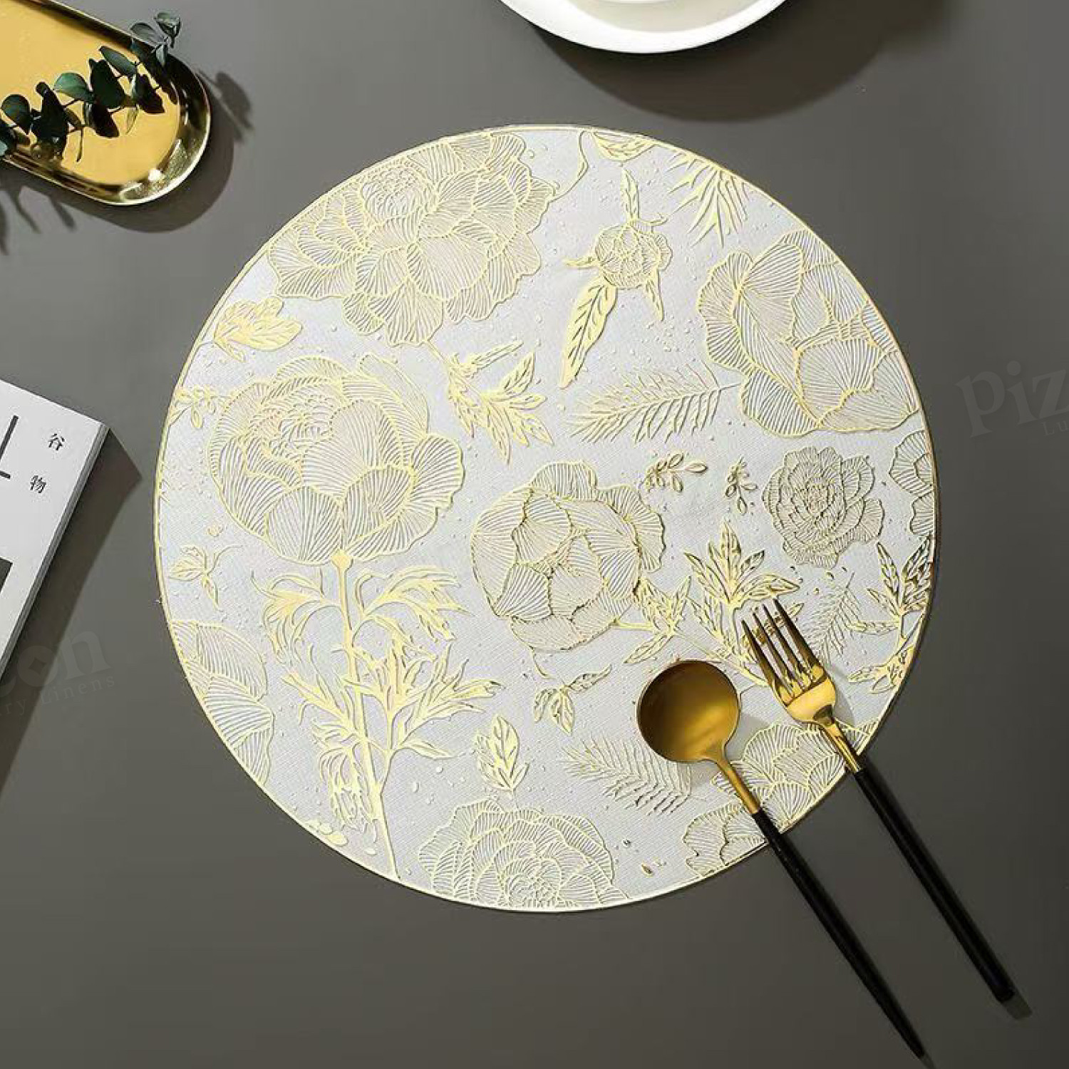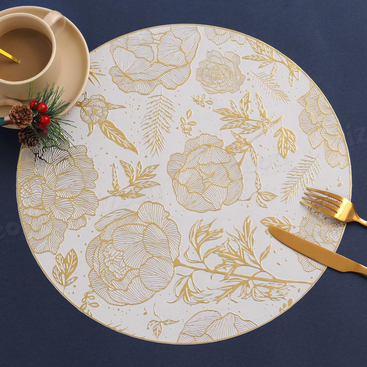 Round Floral Placemat for Dining Table - High Quality,, Elegant Golden Floral Design on White, Durable Kitchen & Dining Decor, Perfect Gift for Mother’s Day, Valentine’s, Birthdays, Special Occasion Tableware | Luxurious Table Accessory | High Quality Placemat